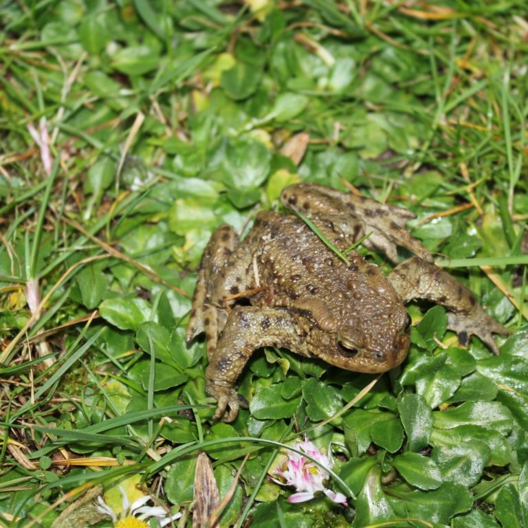 Auf unserem Stiftungsgelände wurde eine Erdkröte (Bufo bufo) beobachtet. Sie lebt bevorzugt in feuchten, naturnahen Lebensräumen und ist vor allem nachts aktiv. Erdkröten ernähren sich von Insekten und anderen Kleintieren und tragen zur natürlichen Schädlingskontrolle bei.