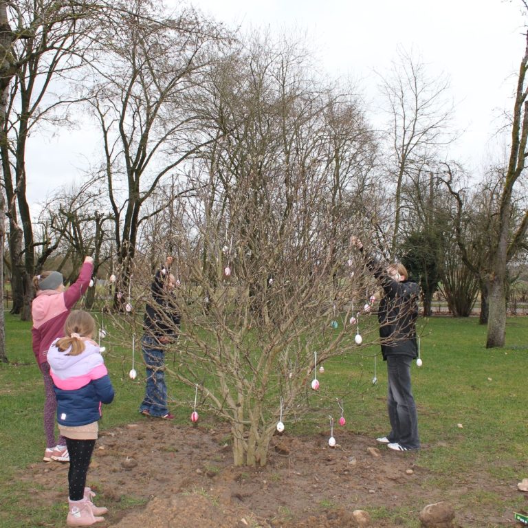 Kinder haben unsere umgepflanzte Magnolie passend zu Ostern mit selbst bemalten Eiern geschmückt und so für eine fröhliche, farbenfrohe Atmosphäre auf unserem Gelände gesorgt.