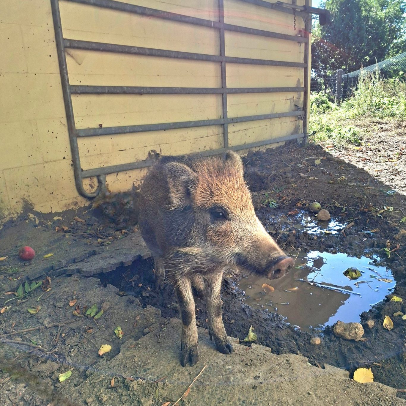 Der junge Frischlingskeiler Fridolin wurde mutterlos am Straßenrand aufgefunden. Mitarbeitende des Lottihof e.V. haben ihn daraufhin mit der Flasche aufgezogen und versorgt. Nun konnte er bei uns ein neues Zuhause finden.